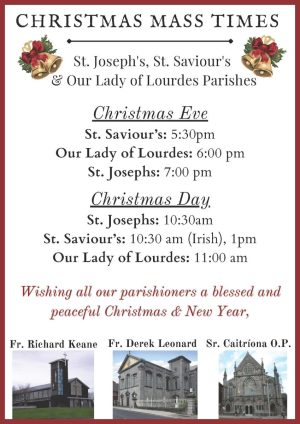 St. Saviour’s: 5:30pm Christmas eve; 10:30am (Irish) & 1pm Christmas day.