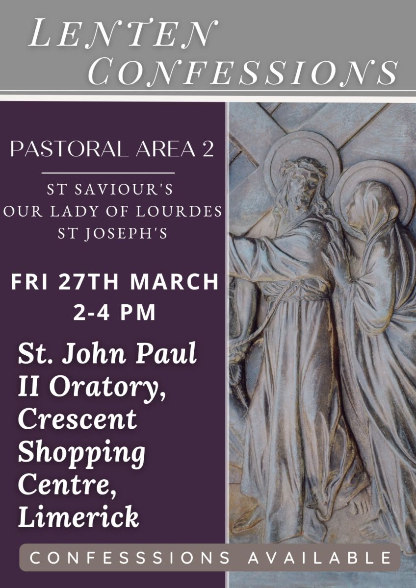 Friday 27th March 2-4pm, St. John Paul II Oratory, Cresent Shopping Centre, Limerick, Confessions Available.