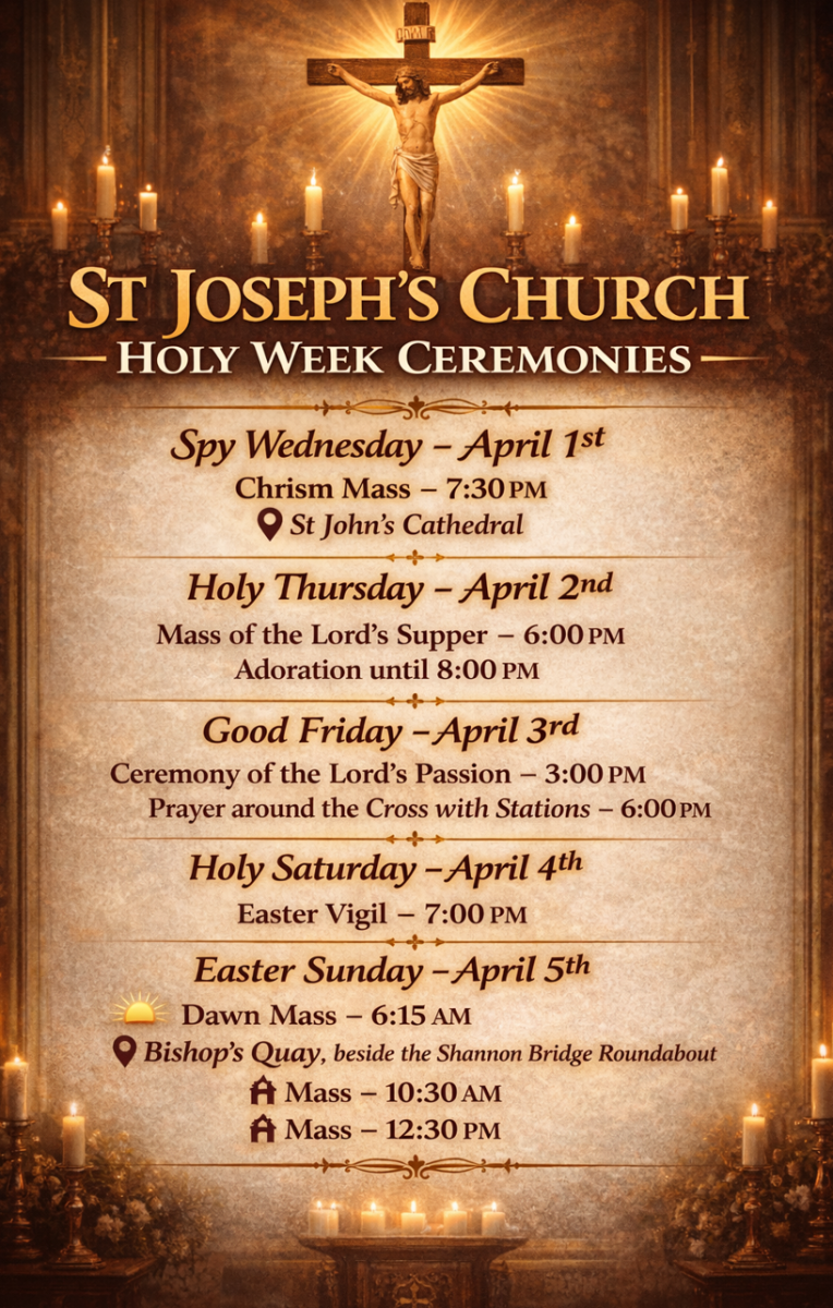 Easter Sunday, April 5th: Dawn Mass at 6:15am at Bishop’s Quay, beside the Shannon Bridge roundabout (New Bridge), Mass at: 10:30am and 12:30pm